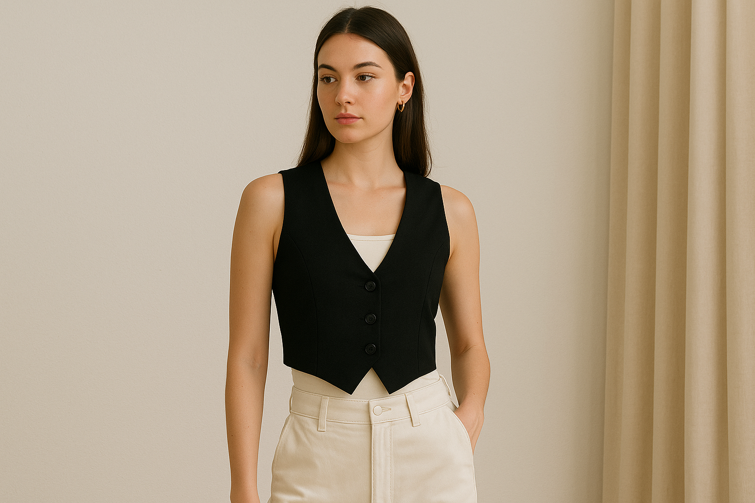 ✨ Este chaleco cropped transforma cualquier look básico en uno moderno y sofisticado en segundos.